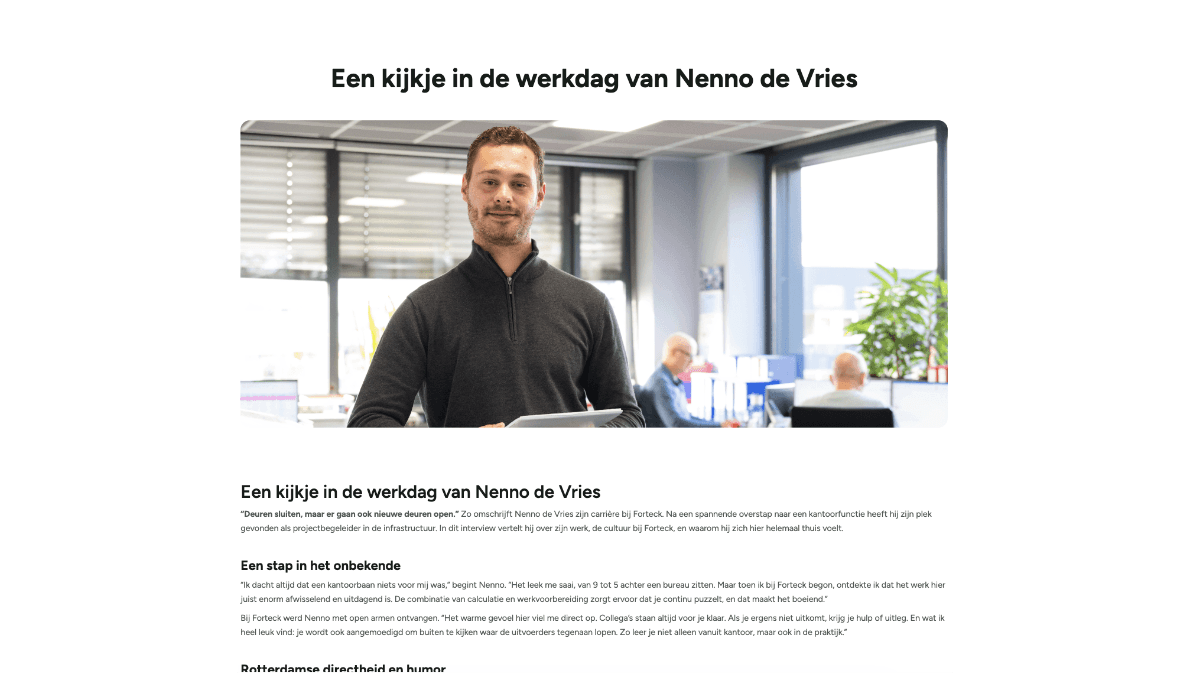 Forteck wilde laten zien hoe het is om er te werken. Niet met marketingtaal, maar met echte verhalen van medewerkers. In opdracht van Oceantalent hield ik een dag lang vijf interviews op locatie, coördineerde met de fotograaf en werkte alles uit tot personeelsprofielen. Het resultaat staat op werkenbijforteck.com: authentieke portretten die sollicitanten een eerlijk beeld geven van de werkcultuur.