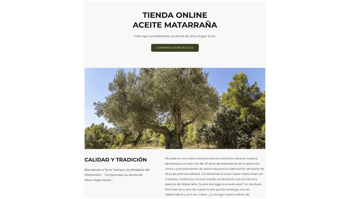 Torre Gachero is een Spaanse olijvenmolen die al decennia draait, maar nooit aan marketing deed. Na de overname door Nederlandse eigenaren moest dat veranderen. Het bedrijf bedient lokale boeren die hun olijven laten persen, B2B-afnemers én eigen consumentenmerken zoals Matarraña en El Príncipe Verde. Ik ontwikkelde de volledige visuele identiteit: huisstijl, website en webshop. Van nul naar een professionele uitstraling die past bij de ambities van de nieuwe eigenaren.